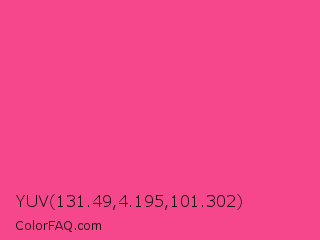 YUV 131.49,4.195,101.302 Color is a light rose color and the nearest color is Violet Red #f7468a. Hex code #f7478c and RGB value is rgb(247,71,140). In RGB color space, this color is composed of 97% red, 28% green, 55% blue, In CMYK color space, this color is composed of 0% cyan, 71% magenta, 43% yellow , 3% black , In HSL color space, this color has a hue angle of 336° , 92% saturation and 62% lightness.