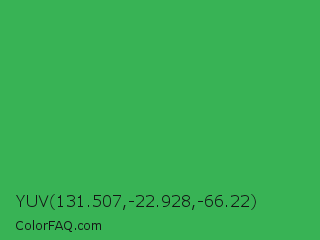 YUV 131.507,-22.928,-66.22 Color is a normal green color and the nearest color is Chateau Green #40a860. Hex code #38b355 and RGB value is rgb(56,179,85). In RGB color space, this color is composed of 22% red, 70% green, 33% blue, In CMYK color space, this color is composed of 69% cyan, 0% magenta, 53% yellow , 30% black , In HSL color space, this color has a hue angle of 134° , 52% saturation and 46% lightness.