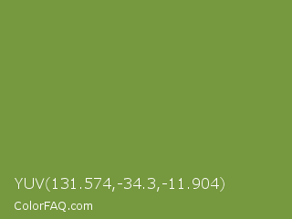 YUV 131.574,-34.3,-11.904 Color is a normal green color and the nearest color is Palm Leaf #6f9940. Hex code #76983e and RGB value is rgb(118,152,62). In RGB color space, this color is composed of 46% red, 60% green, 24% blue, In CMYK color space, this color is composed of 22% cyan, 0% magenta, 59% yellow , 40% black , In HSL color space, this color has a hue angle of 83° , 42% saturation and 42% lightness.