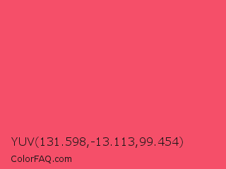YUV 131.598,-13.113,99.454 Color is a light red color and the nearest color is Infra Red #ff496c. Hex code #f54f69 and RGB value is rgb(245,79,105). In RGB color space, this color is composed of 96% red, 31% green, 41% blue, In CMYK color space, this color is composed of 0% cyan, 68% magenta, 57% yellow , 4% black , In HSL color space, this color has a hue angle of 351° , 89% saturation and 64% lightness.