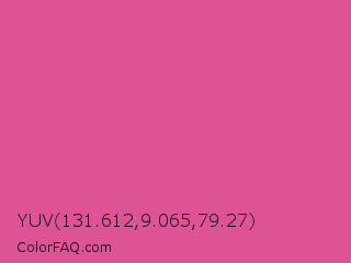YUV 131.612,9.065,79.27 Color is a normal rose color and the nearest color is Raspberry Pink #e25098. Hex code #de5296 and RGB value is rgb(222,82,150). In RGB color space, this color is composed of 87% red, 32% green, 59% blue, In CMYK color space, this color is composed of 0% cyan, 63% magenta, 32% yellow , 13% black , In HSL color space, this color has a hue angle of 331° , 68% saturation and 60% lightness.
