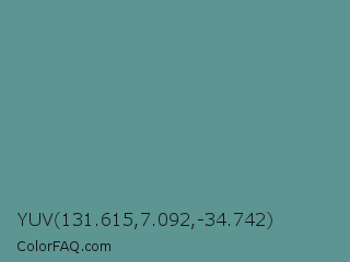 YUV 131.615,7.092,-34.742 Color is a normal cyan color and the nearest color is Patina #639a8f. Hex code #5c9592 and RGB value is rgb(92,149,146). In RGB color space, this color is composed of 36% red, 58% green, 57% blue, In CMYK color space, this color is composed of 38% cyan, 0% magenta, 2% yellow , 42% black , In HSL color space, this color has a hue angle of 177° , 24% saturation and 47% lightness.