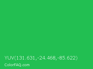 YUV 131.631,-24.468,-85.622 Color is a normal green color and the nearest color is Malachite #0bda51. Hex code #22bf52 and RGB value is rgb(34,191,82). In RGB color space, this color is composed of 13% red, 75% green, 32% blue, In CMYK color space, this color is composed of 82% cyan, 0% magenta, 57% yellow , 25% black , In HSL color space, this color has a hue angle of 138° , 70% saturation and 44% lightness.