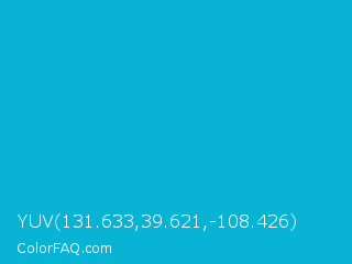 YUV 131.633,39.621,-108.426 Color is a normal cyan color and the nearest color is Cerulean #02a4d3. Hex code #08b3d4 and RGB value is rgb(8,179,212). In RGB color space, this color is composed of 3% red, 70% green, 83% blue, In CMYK color space, this color is composed of 96% cyan, 16% magenta, 0% yellow , 17% black , In HSL color space, this color has a hue angle of 190° , 93% saturation and 43% lightness.