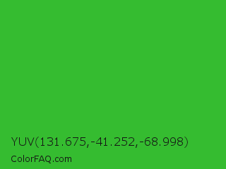 YUV 131.675,-41.252,-68.998 Color is a normal green color and the nearest color is Wageningen Green #34b233. Hex code #35bc30 and RGB value is rgb(53,188,48). In RGB color space, this color is composed of 21% red, 74% green, 19% blue, In CMYK color space, this color is composed of 72% cyan, 0% magenta, 74% yellow , 26% black , In HSL color space, this color has a hue angle of 118° , 59% saturation and 46% lightness.