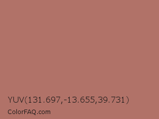 YUV 131.697,-13.655,39.731 Color is a normal red color and the nearest color is Copper Penny #ad6f69. Hex code #b17268 and RGB value is rgb(177,114,104). In RGB color space, this color is composed of 69% red, 45% green, 41% blue, In CMYK color space, this color is composed of 0% cyan, 36% magenta, 41% yellow , 31% black , In HSL color space, this color has a hue angle of 8° , 32% saturation and 55% lightness.
