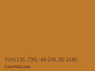 YUV 131.739,-44.241,50.218 Color is a normal orange color and the nearest color is Copper #b87333. Hex code #bd782a and RGB value is rgb(189,120,42). In RGB color space, this color is composed of 74% red, 47% green, 16% blue, In CMYK color space, this color is composed of 0% cyan, 37% magenta, 78% yellow , 26% black , In HSL color space, this color has a hue angle of 32° , 64% saturation and 45% lightness.