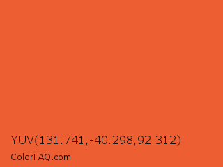 YUV 131.741,-40.298,92.312 Color is a normal red color and the nearest color is Flamingo #f2552a. Hex code #ed5e32 and RGB value is rgb(237,94,50). In RGB color space, this color is composed of 93% red, 37% green, 20% blue, In CMYK color space, this color is composed of 0% cyan, 60% magenta, 79% yellow , 7% black , In HSL color space, this color has a hue angle of 14° , 84% saturation and 56% lightness.