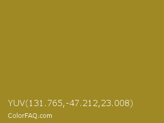YUV 131.765,-47.212,23.008 Color is a normal yellow color and the nearest color is Reef Gold #9f821c. Hex code #9e8924 and RGB value is rgb(158,137,36). In RGB color space, this color is composed of 62% red, 54% green, 14% blue, In CMYK color space, this color is composed of 0% cyan, 13% magenta, 77% yellow , 38% black , In HSL color space, this color has a hue angle of 50° , 63% saturation and 38% lightness.
