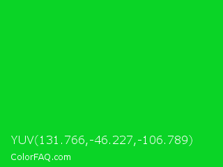 YUV 131.766,-46.227,-106.789 Color is a normal green color and the nearest color is Vivid Malachite #00cc33. Hex code #0ad426 and RGB value is rgb(10,212,38). In RGB color space, this color is composed of 4% red, 83% green, 15% blue, In CMYK color space, this color is composed of 95% cyan, 0% magenta, 82% yellow , 17% black , In HSL color space, this color has a hue angle of 128° , 91% saturation and 44% lightness.