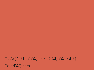 YUV 131.774,-27.004,74.743 Color is a normal red color and the nearest color is Jelly Bean #da614e. Hex code #d9634d and RGB value is rgb(217,99,77). In RGB color space, this color is composed of 85% red, 39% green, 30% blue, In CMYK color space, this color is composed of 0% cyan, 54% magenta, 65% yellow , 15% black , In HSL color space, this color has a hue angle of 9° , 65% saturation and 58% lightness.
