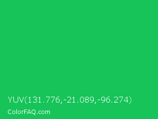 YUV 131.776,-21.089,-96.274 Color is a normal green color and the nearest color is Malachite #0bda51. Hex code #16c459 and RGB value is rgb(22,196,89). In RGB color space, this color is composed of 9% red, 77% green, 35% blue, In CMYK color space, this color is composed of 89% cyan, 0% magenta, 55% yellow , 23% black , In HSL color space, this color has a hue angle of 143° , 80% saturation and 43% lightness.