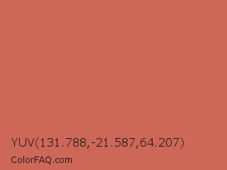 YUV 131.788,-21.587,64.207 Color is a normal red color and the nearest color is Copper Red #cb6d51. Hex code #cd6758 and RGB value is rgb(205,103,88). In RGB color space, this color is composed of 80% red, 40% green, 35% blue, In CMYK color space, this color is composed of 0% cyan, 50% magenta, 57% yellow , 20% black , In HSL color space, this color has a hue angle of 8° , 54% saturation and 57% lightness.