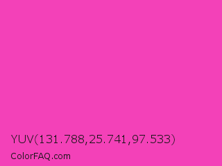 YUV 131.788,25.741,97.533 Color is a normal magenta color and the nearest color is Frostbite #e936a7. Hex code #f341b8 and RGB value is rgb(243,65,184). In RGB color space, this color is composed of 95% red, 25% green, 72% blue, In CMYK color space, this color is composed of 0% cyan, 73% magenta, 24% yellow , 5% black , In HSL color space, this color has a hue angle of 320° , 88% saturation and 60% lightness.