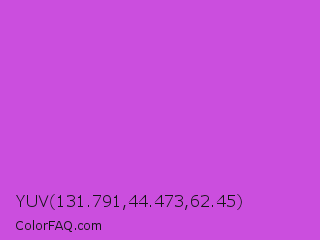 YUV 131.791,44.473,62.45 Color is a normal magenta color and the nearest color is Medium Orchid #ba55d3. Hex code #cb4ede and RGB value is rgb(203,78,222). In RGB color space, this color is composed of 80% red, 31% green, 87% blue, In CMYK color space, this color is composed of 9% cyan, 65% magenta, 0% yellow , 13% black , In HSL color space, this color has a hue angle of 292° , 69% saturation and 59% lightness.