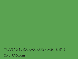 YUV 131.825,-25.057,-36.681 Color is a normal green color and the nearest color is Fruit Salad #4f9d5d. Hex code #5aa351 and RGB value is rgb(90,163,81). In RGB color space, this color is composed of 35% red, 64% green, 32% blue, In CMYK color space, this color is composed of 45% cyan, 0% magenta, 50% yellow , 36% black , In HSL color space, this color has a hue angle of 113° , 34% saturation and 48% lightness.
