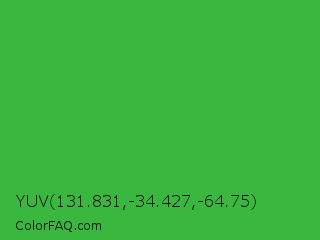 YUV 131.831,-34.427,-64.75 Color is a normal green color and the nearest color is Wageningen Green #34b233. Hex code #3ab73e and RGB value is rgb(58,183,62). In RGB color space, this color is composed of 23% red, 72% green, 24% blue, In CMYK color space, this color is composed of 68% cyan, 0% magenta, 66% yellow , 28% black , In HSL color space, this color has a hue angle of 122° , 52% saturation and 47% lightness.