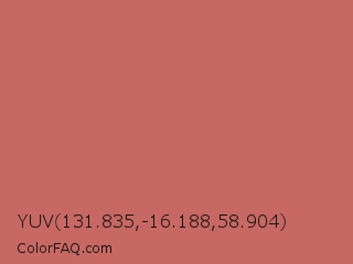YUV 131.835,-16.188,58.904 Color is a normal red color and the nearest color is Fuzzy Wuzzy #cc6666. Hex code #c76863 and RGB value is rgb(199,104,99). In RGB color space, this color is composed of 78% red, 41% green, 39% blue, In CMYK color space, this color is composed of 0% cyan, 48% magenta, 50% yellow , 22% black , In HSL color space, this color has a hue angle of 3° , 47% saturation and 58% lightness.
