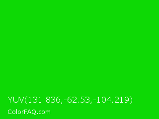YUV 131.836,-62.53,-104.219 Color is a normal green color and the nearest color is Green #00ff00. Hex code #0dd905 and RGB value is rgb(13,217,5). In RGB color space, this color is composed of 5% red, 85% green, 2% blue, In CMYK color space, this color is composed of 94% cyan, 0% magenta, 98% yellow , 15% black , In HSL color space, this color has a hue angle of 118° , 95% saturation and 44% lightness.