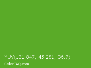 YUV 131.847,-45.281,-36.7 Color is a normal green color and the nearest color is Green RYB #66b032. Hex code #5aab28 and RGB value is rgb(90,171,40). In RGB color space, this color is composed of 35% red, 67% green, 16% blue, In CMYK color space, this color is composed of 47% cyan, 0% magenta, 77% yellow , 33% black , In HSL color space, this color has a hue angle of 97° , 62% saturation and 41% lightness.