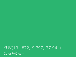 YUV 131.872,-9.797,-77.941 Color is a normal green color and the nearest color is Medium Sea Green #3cb371. Hex code #2bb570 and RGB value is rgb(43,181,112). In RGB color space, this color is composed of 17% red, 71% green, 44% blue, In CMYK color space, this color is composed of 76% cyan, 0% magenta, 38% yellow , 29% black , In HSL color space, this color has a hue angle of 150° , 62% saturation and 44% lightness.