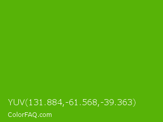 YUV 131.884,-61.568,-39.363 Color is a normal green color and the nearest color is Kelly Green #4cbb17. Hex code #57b307 and RGB value is rgb(87,179,7). In RGB color space, this color is composed of 34% red, 70% green, 3% blue, In CMYK color space, this color is composed of 51% cyan, 0% magenta, 96% yellow , 30% black , In HSL color space, this color has a hue angle of 92° , 92% saturation and 36% lightness.