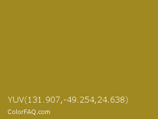 YUV 131.907,-49.254,24.638 Color is a normal yellow color and the nearest color is Reef Gold #9f821c. Hex code #a08920 and RGB value is rgb(160,137,32). In RGB color space, this color is composed of 63% red, 54% green, 13% blue, In CMYK color space, this color is composed of 0% cyan, 14% magenta, 80% yellow , 37% black , In HSL color space, this color has a hue angle of 49° , 67% saturation and 38% lightness.