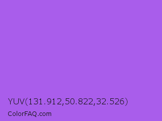 YUV 131.912,50.822,32.526 Color is a light purple color and the nearest color is Navy Purple #9457eb. Hex code #a95deb and RGB value is rgb(169,93,235). In RGB color space, this color is composed of 66% red, 36% green, 92% blue, In CMYK color space, this color is composed of 28% cyan, 60% magenta, 0% yellow , 8% black , In HSL color space, this color has a hue angle of 272° , 78% saturation and 64% lightness.