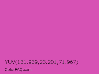 YUV 131.939,23.201,71.967 Color is a normal magenta color and the nearest color is Fuchsia Pink #c154c1. Hex code #d651b3 and RGB value is rgb(214,81,179). In RGB color space, this color is composed of 84% red, 32% green, 70% blue, In CMYK color space, this color is composed of 0% cyan, 62% magenta, 16% yellow , 16% black , In HSL color space, this color has a hue angle of 316° , 62% saturation and 58% lightness.