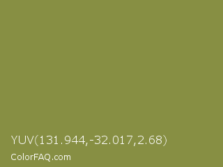 YUV 131.944,-32.017,2.68 Color is a normal yellow color and the nearest color is Sycamore #908d39. Hex code #878f43 and RGB value is rgb(135,143,67). In RGB color space, this color is composed of 53% red, 56% green, 26% blue, In CMYK color space, this color is composed of 6% cyan, 0% magenta, 53% yellow , 44% black , In HSL color space, this color has a hue angle of 66° , 36% saturation and 41% lightness.