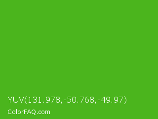 YUV 131.978,-50.768,-49.97 Color is a normal green color and the nearest color is Kelly Green #4cbb17. Hex code #4bb51d and RGB value is rgb(75,181,29). In RGB color space, this color is composed of 29% red, 71% green, 11% blue, In CMYK color space, this color is composed of 59% cyan, 0% magenta, 84% yellow , 29% black , In HSL color space, this color has a hue angle of 102° , 72% saturation and 41% lightness.