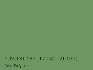 YUV 131.987,-17.249,-21.037 Color is a normal green color and the nearest color is Russian Green #679267. Hex code #6c9761 and RGB value is rgb(108,151,97). In RGB color space, this color is composed of 42% red, 59% green, 38% blue, In CMYK color space, this color is composed of 28% cyan, 0% magenta, 36% yellow , 41% black , In HSL color space, this color has a hue angle of 108° , 22% saturation and 49% lightness.