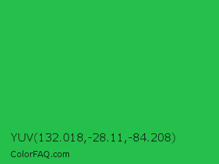 YUV 132.018,-28.11,-84.208 Color is a normal green color and the nearest color is Lime Green #32cd32. Hex code #24c04b and RGB value is rgb(36,192,75). In RGB color space, this color is composed of 14% red, 75% green, 29% blue, In CMYK color space, this color is composed of 81% cyan, 0% magenta, 61% yellow , 25% black , In HSL color space, this color has a hue angle of 135° , 68% saturation and 45% lightness.