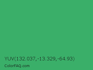 YUV 132.037,-13.329,-64.93 Color is a normal green color and the nearest color is Medium Sea Green #3cb371. Hex code #3aaf69 and RGB value is rgb(58,175,105). In RGB color space, this color is composed of 23% red, 69% green, 41% blue, In CMYK color space, this color is composed of 67% cyan, 0% magenta, 40% yellow , 31% black , In HSL color space, this color has a hue angle of 144° , 50% saturation and 46% lightness.
