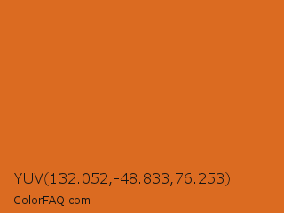 YUV 132.052,-48.833,76.253 Color is a normal orange color and the nearest color is Hot Cinnamon #d2691e. Hex code #db6b21 and RGB value is rgb(219,107,33). In RGB color space, this color is composed of 86% red, 42% green, 13% blue, In CMYK color space, this color is composed of 0% cyan, 51% magenta, 85% yellow , 14% black , In HSL color space, this color has a hue angle of 24° , 74% saturation and 49% lightness.
