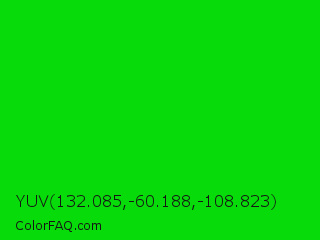 YUV 132.085,-60.188,-108.823 Color is a normal green color and the nearest color is Green #00ff00. Hex code #08db0a and RGB value is rgb(8,219,10). In RGB color space, this color is composed of 3% red, 86% green, 4% blue, In CMYK color space, this color is composed of 96% cyan, 0% magenta, 95% yellow , 14% black , In HSL color space, this color has a hue angle of 121° , 93% saturation and 45% lightness.