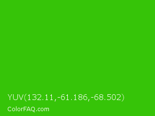 YUV 132.11,-61.186,-68.502 Color is a normal green color and the nearest color is Harlequin Green #46cb18. Hex code #36c408 and RGB value is rgb(54,196,8). In RGB color space, this color is composed of 21% red, 77% green, 3% blue, In CMYK color space, this color is composed of 72% cyan, 0% magenta, 96% yellow , 23% black , In HSL color space, this color has a hue angle of 105° , 92% saturation and 40% lightness.