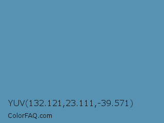YUV 132.121,23.111,-39.571 Color is a normal blue color and the nearest color is Hippie Blue #589aaf. Hex code #5792b3 and RGB value is rgb(87,146,179). In RGB color space, this color is composed of 34% red, 57% green, 70% blue, In CMYK color space, this color is composed of 51% cyan, 18% magenta, 0% yellow , 30% black , In HSL color space, this color has a hue angle of 202° , 38% saturation and 52% lightness.