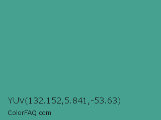 YUV 132.152,5.841,-53.63 Color is a normal cyan color and the nearest color is Zomp #39a78e. Hex code #47a190 and RGB value is rgb(71,161,144). In RGB color space, this color is composed of 28% red, 63% green, 56% blue, In CMYK color space, this color is composed of 56% cyan, 0% magenta, 11% yellow , 37% black , In HSL color space, this color has a hue angle of 169° , 39% saturation and 45% lightness.