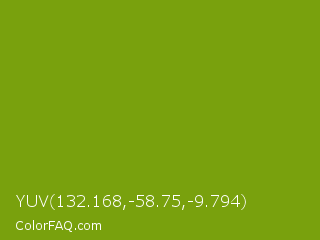 YUV 132.168,-58.75,-9.794 Color is a normal lime color and the nearest color is Limeade #6f9d02. Hex code #79a10d and RGB value is rgb(121,161,13). In RGB color space, this color is composed of 47% red, 63% green, 5% blue, In CMYK color space, this color is composed of 25% cyan, 0% magenta, 92% yellow , 37% black , In HSL color space, this color has a hue angle of 76° , 85% saturation and 34% lightness.