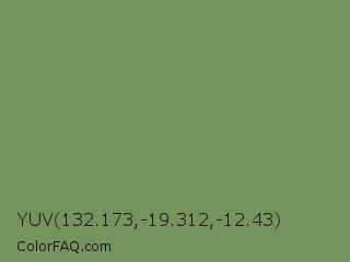 YUV 132.173,-19.312,-12.43 Color is a normal green color and the nearest color is Highland #6f8e63. Hex code #76935d and RGB value is rgb(118,147,93). In RGB color space, this color is composed of 46% red, 58% green, 36% blue, In CMYK color space, this color is composed of 20% cyan, 0% magenta, 37% yellow , 42% black , In HSL color space, this color has a hue angle of 92° , 23% saturation and 47% lightness.