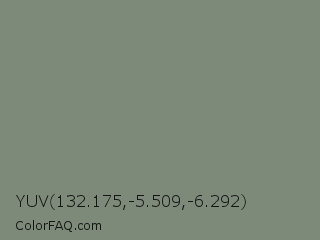 YUV 132.175,-5.509,-6.292 Color is a normal green color and the nearest color is Battleship Gray #828f72. Hex code #7d8a79 and RGB value is rgb(125,138,121). In RGB color space, this color is composed of 49% red, 54% green, 47% blue, In CMYK color space, this color is composed of 9% cyan, 0% magenta, 12% yellow , 46% black , In HSL color space, this color has a hue angle of 106° , 7% saturation and 51% lightness.