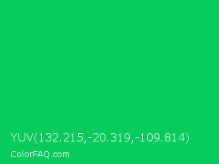 YUV 132.215,-20.319,-109.814 Color is a normal green color and the nearest color is Malachite #0bda51. Hex code #07cc5b and RGB value is rgb(7,204,91). In RGB color space, this color is composed of 3% red, 80% green, 36% blue, In CMYK color space, this color is composed of 97% cyan, 0% magenta, 55% yellow , 20% black , In HSL color space, this color has a hue angle of 146° , 93% saturation and 41% lightness.