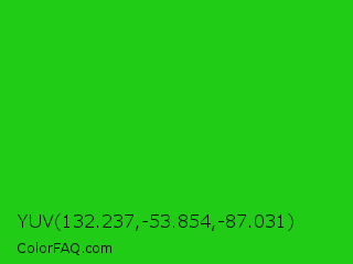 YUV 132.237,-53.854,-87.031 Color is a normal green color and the nearest color is Lime Green #32cd32. Hex code #21cc17 and RGB value is rgb(33,204,23). In RGB color space, this color is composed of 13% red, 80% green, 9% blue, In CMYK color space, this color is composed of 84% cyan, 0% magenta, 89% yellow , 20% black , In HSL color space, this color has a hue angle of 117° , 80% saturation and 45% lightness.