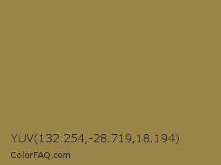 YUV 132.254,-28.719,18.194 Color is a normal orange color and the nearest color is Dark Tan #918151. Hex code #99854a and RGB value is rgb(153,133,74). In RGB color space, this color is composed of 60% red, 52% green, 29% blue, In CMYK color space, this color is composed of 0% cyan, 13% magenta, 52% yellow , 40% black , In HSL color space, this color has a hue angle of 45° , 35% saturation and 45% lightness.