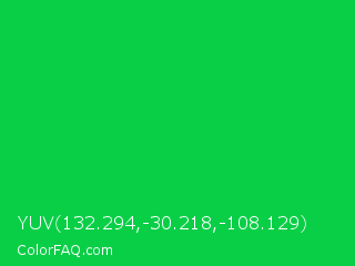 YUV 132.294,-30.218,-108.129 Color is a normal green color and the nearest color is Malachite #0bda51. Hex code #09cf47 and RGB value is rgb(9,207,71). In RGB color space, this color is composed of 4% red, 81% green, 28% blue, In CMYK color space, this color is composed of 96% cyan, 0% magenta, 66% yellow , 19% black , In HSL color space, this color has a hue angle of 139° , 92% saturation and 42% lightness.