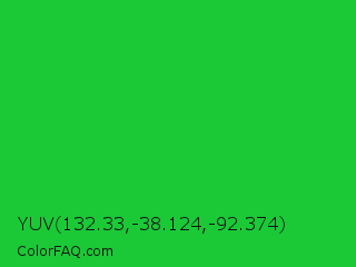 YUV 132.33,-38.124,-92.374 Color is a normal green color and the nearest color is Lime Green #32cd32. Hex code #1bc937 and RGB value is rgb(27,201,55). In RGB color space, this color is composed of 11% red, 79% green, 22% blue, In CMYK color space, this color is composed of 87% cyan, 0% magenta, 73% yellow , 21% black , In HSL color space, this color has a hue angle of 130° , 76% saturation and 45% lightness.