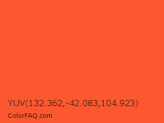 YUV 132.362,-42.083,104.923 Color is a normal red color and the nearest color is Portland Orange #ff5a36. Hex code #fc582f and RGB value is rgb(252,88,47). In RGB color space, this color is composed of 99% red, 35% green, 18% blue, In CMYK color space, this color is composed of 0% cyan, 65% magenta, 81% yellow , 1% black , In HSL color space, this color has a hue angle of 12° , 97% saturation and 59% lightness.