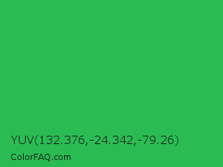 YUV 132.376,-24.342,-79.26 Color is a normal green color and the nearest color is Chateau Green #40a860. Hex code #2abc53 and RGB value is rgb(42,188,83). In RGB color space, this color is composed of 16% red, 74% green, 33% blue, In CMYK color space, this color is composed of 78% cyan, 0% magenta, 56% yellow , 26% black , In HSL color space, this color has a hue angle of 137° , 63% saturation and 45% lightness.