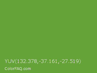 YUV 132.378,-37.161,-27.519 Color is a normal green color and the nearest color is Green RYB #66b032. Hex code #65a339 and RGB value is rgb(101,163,57). In RGB color space, this color is composed of 40% red, 64% green, 22% blue, In CMYK color space, this color is composed of 38% cyan, 0% magenta, 65% yellow , 36% black , In HSL color space, this color has a hue angle of 95° , 48% saturation and 43% lightness.